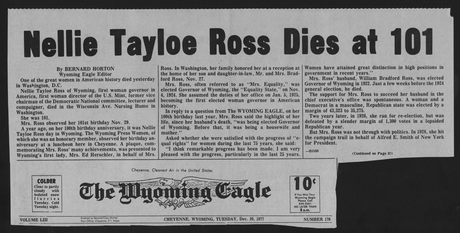 On December 20, 1977, The Wyoming Eagle marked Nellie Tayloe Ross' death with a simple but powerful headline: "Nellie Tayloe Ross Dies at 101." Beneath it, the paper summarized her lifetime of public service and listed her achievements as first woman governor in the United States, first woman director of the U.S. Mint, former vice chairman of the Democratic National Committee, lecturer, and campaigner.