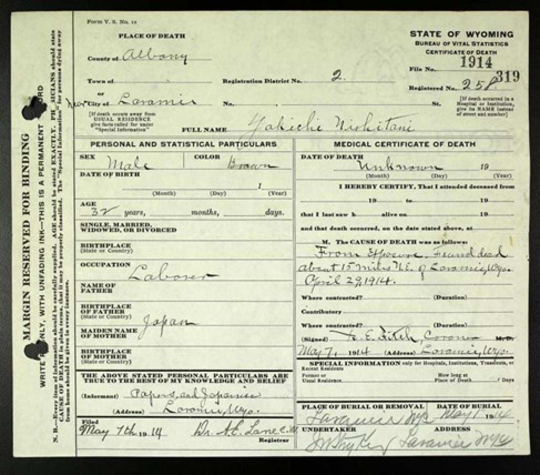 Yakishi Nishitani died five and a half years after Buichi Mori and Osomu Hiromota were killed in the railroad accident. They are all buried in Potter’s Field, in Greenhill Cemetery in Laramie, Wyoming. They were separated in age by only a couple of years. Nishitani’s headstone is the only evidence of Japanese in Potter’s Field.