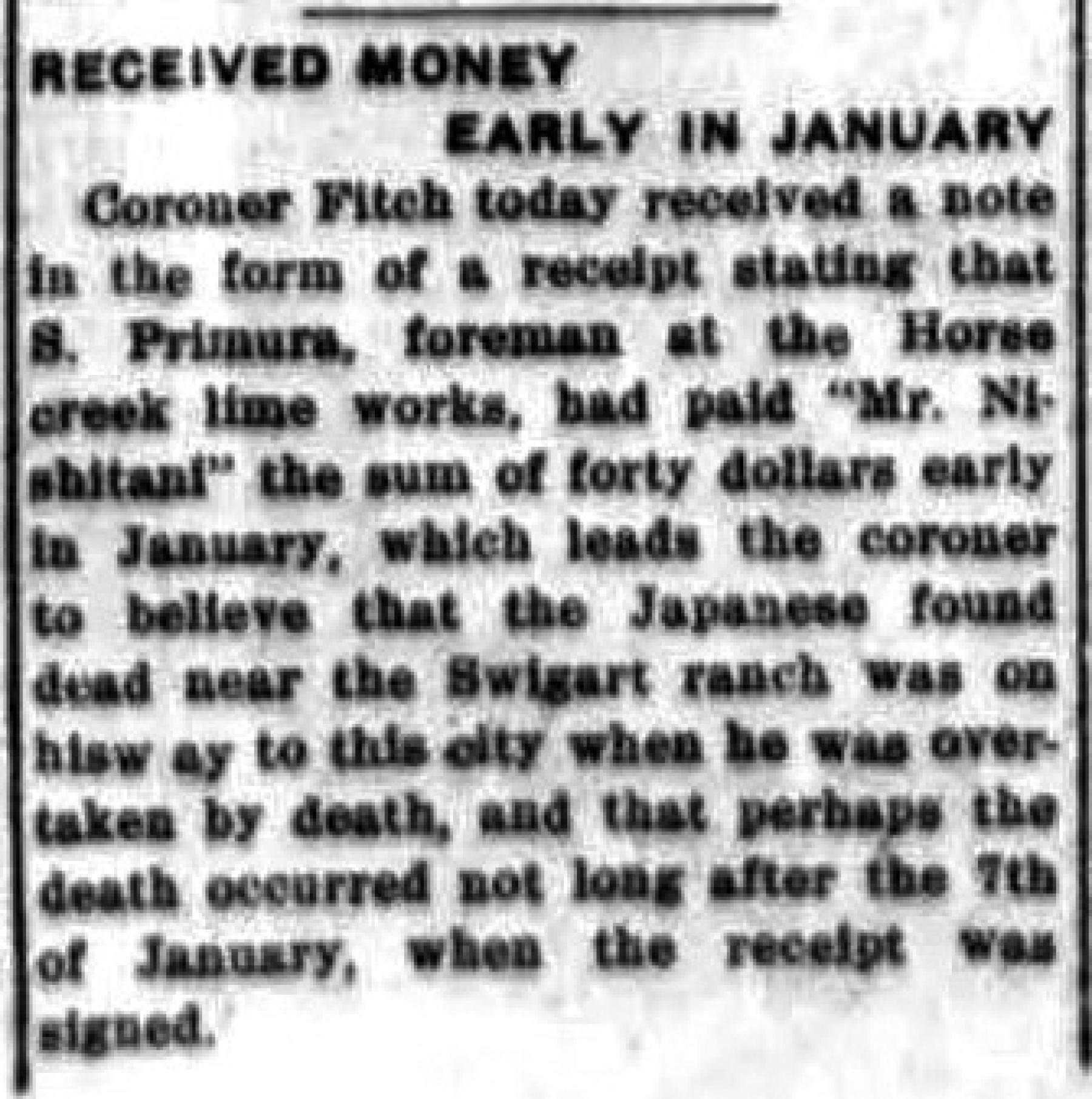 The next day, I spoke with the manager of the cemetery. I asked him about Nishitani’s headstone and Mori and Hiromota. The documentation from that time was not good, he explained, so we don’t know a whole lot. But that headstone has been there since before I started working here, 32 years ago. He sent me some old newspaper articles about the three men who he had found in a digital archive.