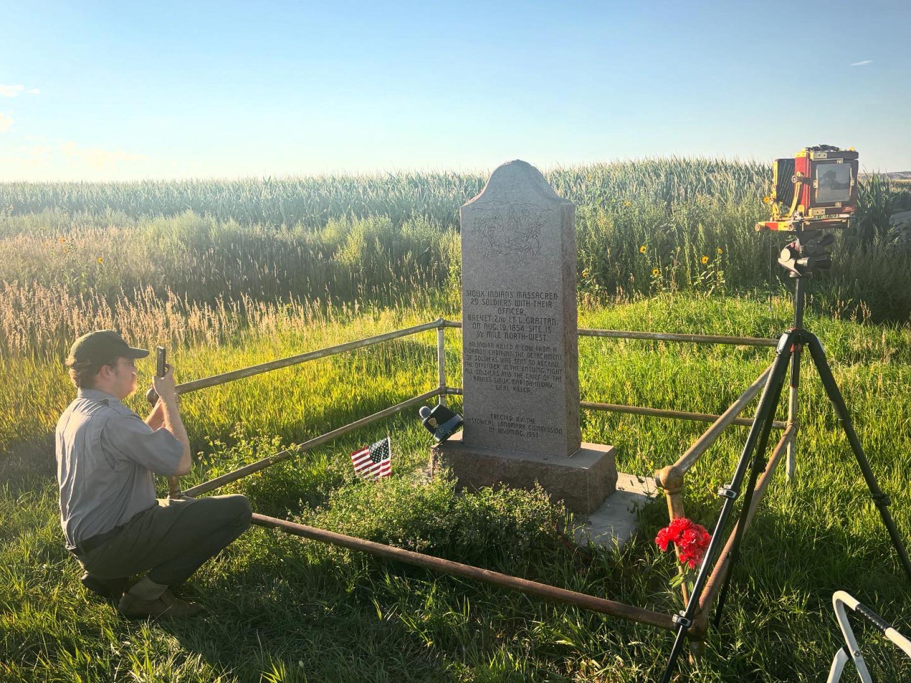 In Wyoming, I photographed two specific sites for the project: the Grattan Fight near Fort Laramie in southeast Wyoming (August 19, 1854) and the Fetterman Fight near Fort Phil Kearny in north-central Wyoming (December 21, 1866). Both incidents are similar in that the small number of US soldiers and their namesake commanders were overwhelmed and killed to a man by far larger numbers of Native American tribal warriors.