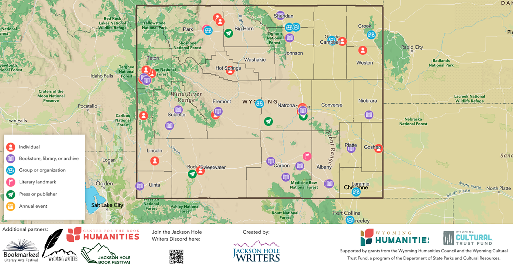 The project was born from a partnership between literary arts entities across four counties: Jackson Hole Writers, Wyoming Writers Inc., the Wyoming Center for the Book, the Bookmarked Literary Arts Festival, and the Jackson Hole Book Festival. Using the natural reach of their cross-county partnership, Jackson Hole Writers built and tested map prototypes with local writers before launching the map in May 2025.