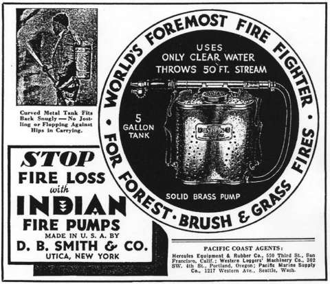 - The advertisement for backpack water pumps for firefighters was published alongside the 1937 Erle Kauffman article in American Forests, cited and linked in the bibliography above. Used with thanks.